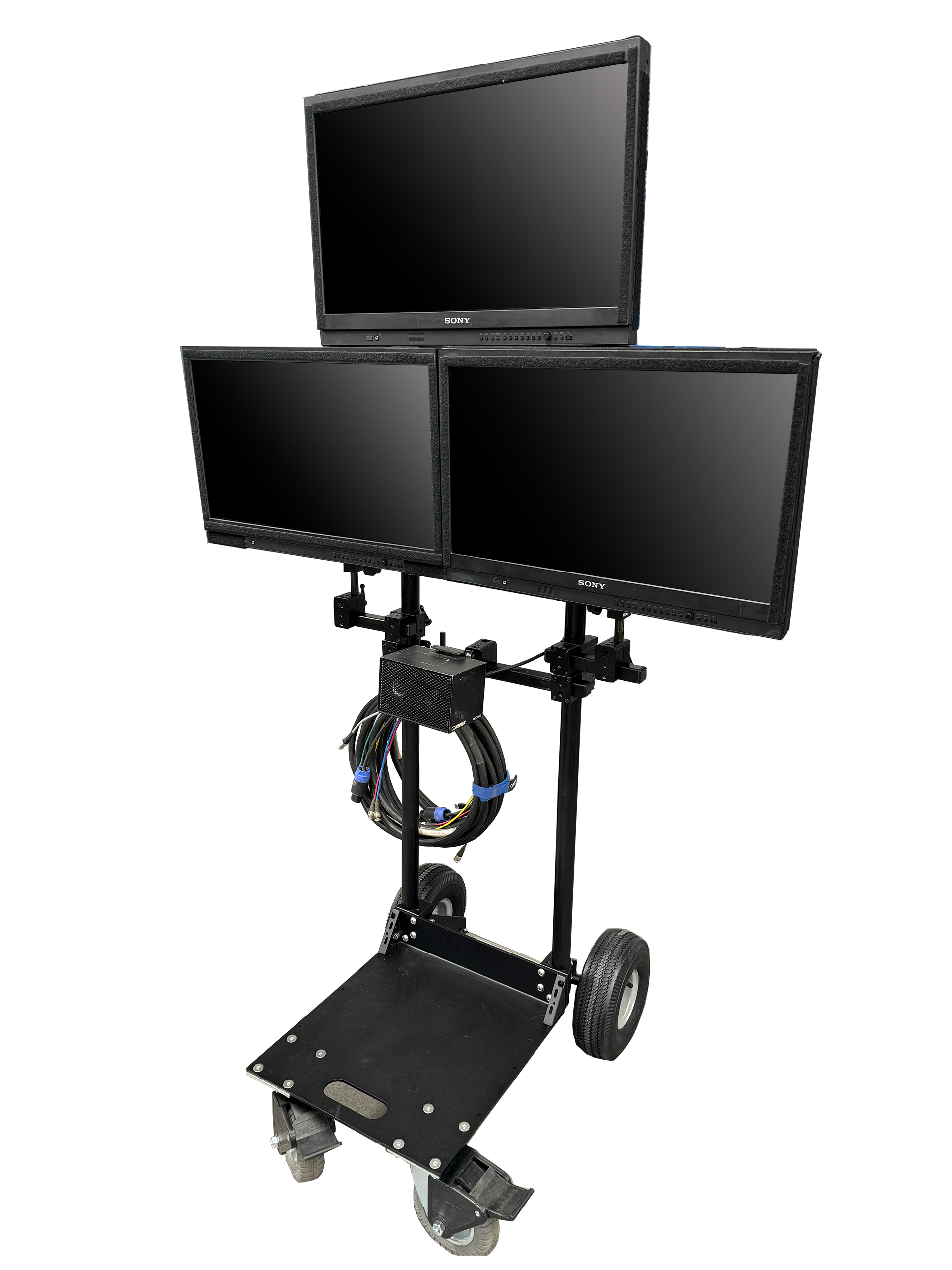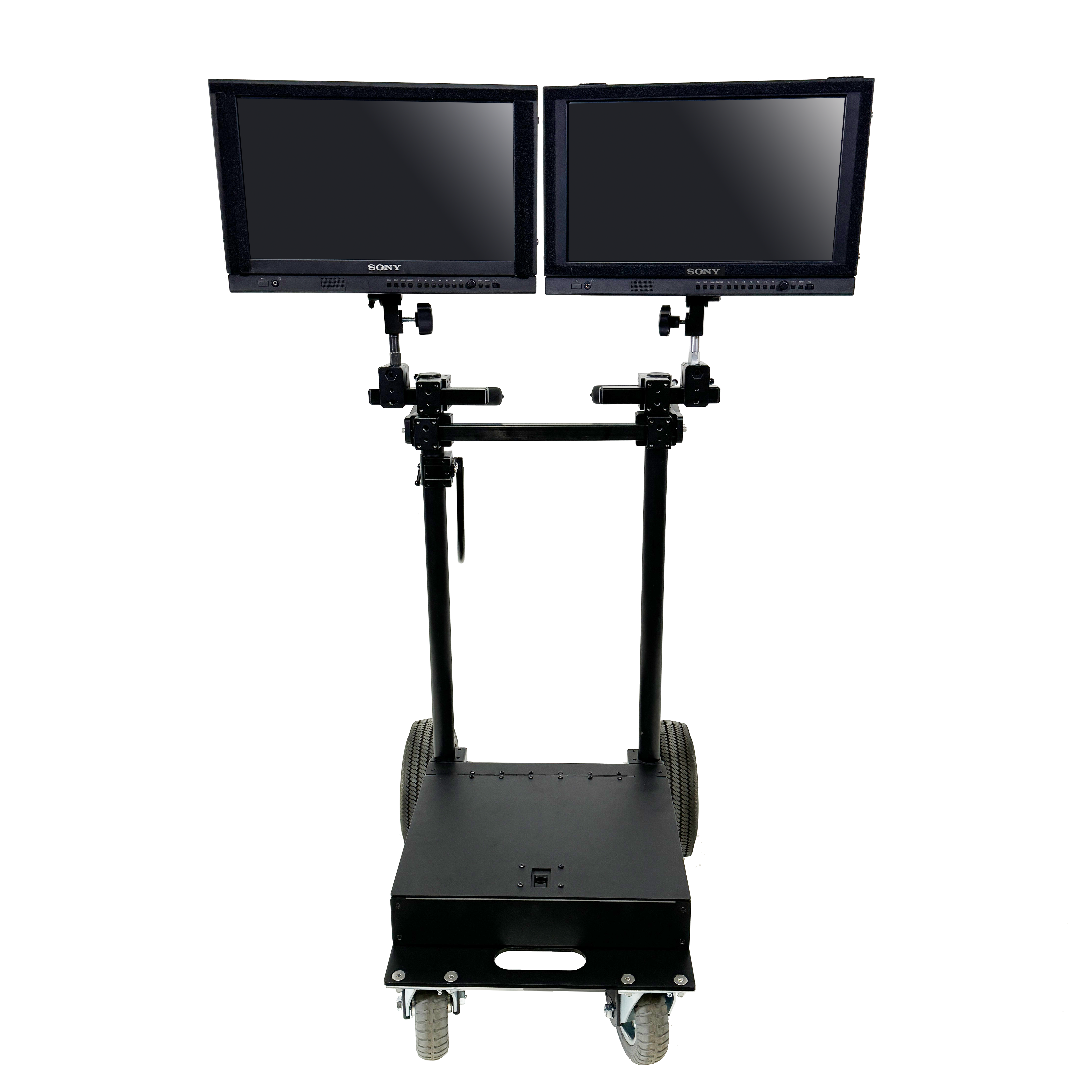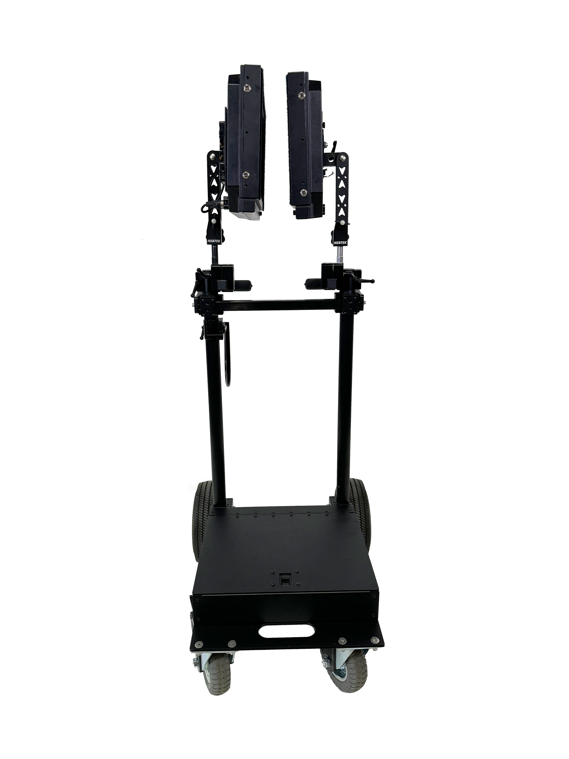 The most versatile Monitor cart ever built. Nebtek has answered the call for a space saving, flexible monitor cart. The ROVR, built for any job, any business. Our unique design allows the cart to be built in many configurations such as a compact 2 monitor mover to a Large screen monitor cart accommodating monitors up to 65″ in both portrait and landscape mode. It’s vertical design means that you will take up less space with this cart then old designs that hog space while working moving or storing in your equipment room or your location trucks. Our Tall multi monitor cart that allows configurations up to 4 monitors that swivel in to get thru doorways.